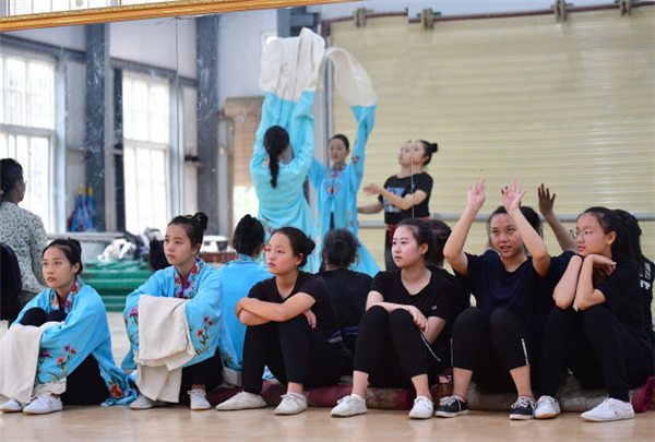 9月13日,“童子班”學員在安康漢江大劇院內排練傳統(tǒng)劇目《拾玉鐲》。