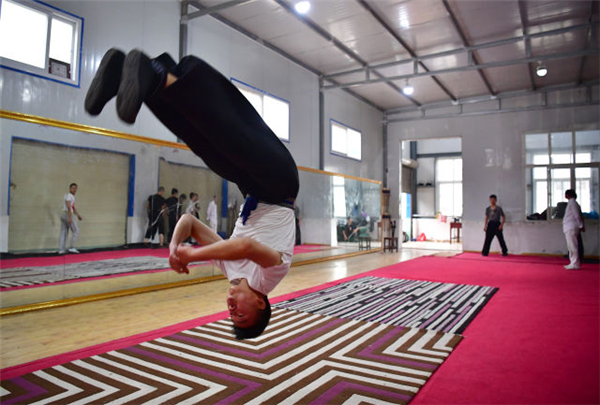 9月12日,“童子班”學員在練功房內練習翻跟頭。