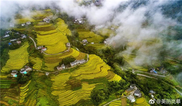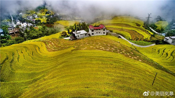 (以下圖為9月15日無人機拍攝的嵐皋縣南宮山鎮(zhèn)桂花村一派豐收景象的古梯田)GyG安康新聞網(wǎng)