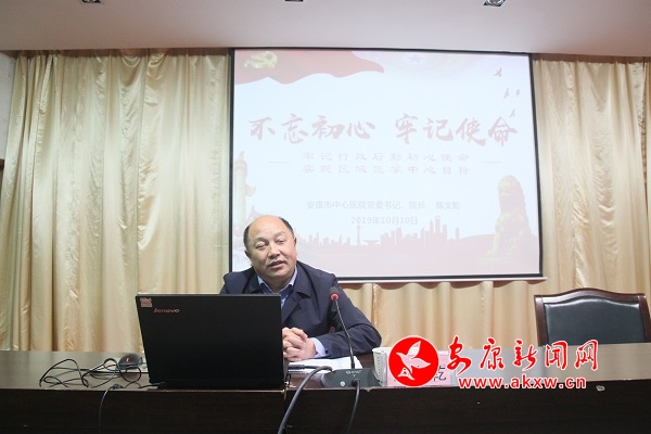 本網(wǎng)訊 10月10日晚上7點(diǎn),安康市中心醫(yī)院召開(kāi)“不忘初心、牢記使命”主題教育專題黨課,醫(yī)院黨委書(shū)記、院長(zhǎng)陳文乾以“牢記行政后勤初心使命,實(shí)現(xiàn)區(qū)域醫(yī)學(xué)中心目標(biāo)”為題,從“牢記醫(yī)院行政后勤初心使命、當(dāng)前行政后勤存在的主要問(wèn)題、做好新時(shí)期醫(yī)院行政后勤工作”等三個(gè)方面進(jìn)行專題黨課輔導(dǎo)。院領(lǐng)導(dǎo)班子成員、行政職能后勤人員200余人聆聽(tīng)了黨課。副院長(zhǎng)董根文主持專題黨課。