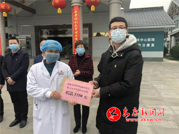 本網(wǎng)訊(記者 董良軍 通訊員 徐偉)2月5日,2020年寒假到市政府機(jī)關(guān)見習(xí)大學(xué)生們向安康市中心醫(yī)院第三醫(yī)院捐助防控疫情專項(xiàng)善款5350元,用于本次疫情防控相關(guān)工作。大學(xué)生代表?xiàng)钛髤⒓恿司栀?zèng)儀式。