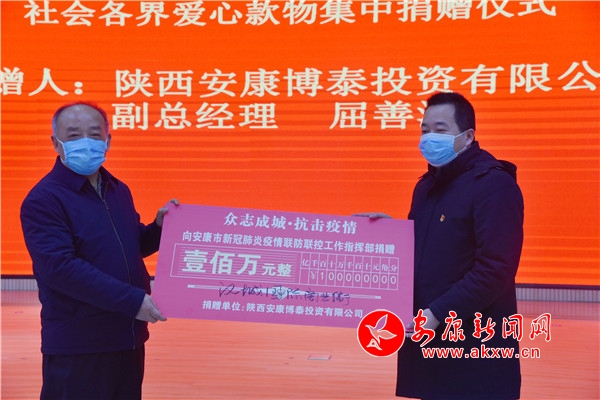 儀式現(xiàn)場(chǎng),陜西安康博泰投資有限公司董事長(zhǎng)、溫州人趙章漢,委托專人向安康市疫情防控指揮部捐贈(zèng)人民幣100萬元,和價(jià)值8余萬元的消毒液1000桶、方便面100箱、礦泉水100箱、蔬菜1000公斤等物資,助力安康戰(zhàn)“疫”。