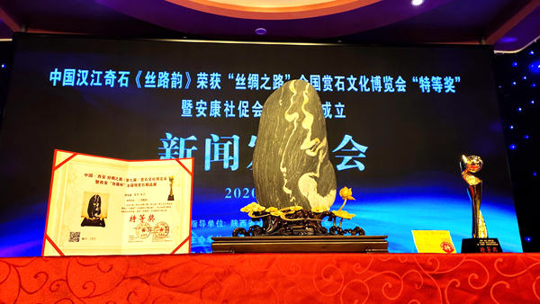 新聞發(fā)布會(huì)上,中國(guó)觀賞石鑒評(píng)師、漢江流域漢江石專(zhuān)家組成員王鐵石同志介紹漢江奇石《絲路韻》獲獎(jiǎng)情況。安康市政協(xié)原副主席李啟良、黃秀玲上臺(tái)為安康社促會(huì)奇石協(xié)會(huì)成立揭牌。安康市社促會(huì)奇石協(xié)會(huì)向石泉縣金蠶小鎮(zhèn)鎏金銅蠶博物館贈(zèng)送了漢江奇石《蠶寶寶》。