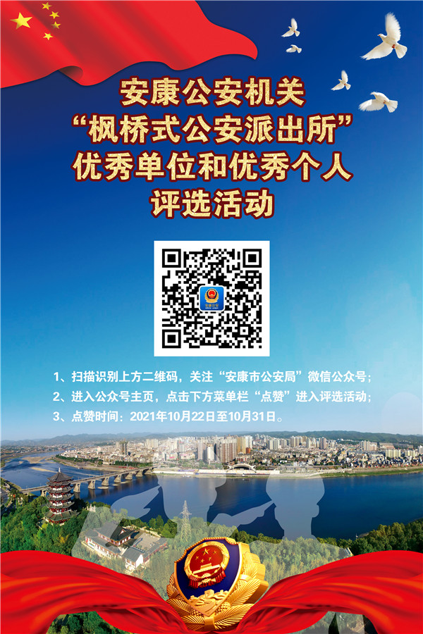 投票方法:即日起至10月31日,廣大群眾只需搜索關(guān)注“安康市公安局”微信公眾號(hào)。按照公眾號(hào)下方提示即可查閱候選對(duì)象詳細(xì)工作業(yè)績(jī),同時(shí)為自己滿意的候選對(duì)象投上寶貴一票。
