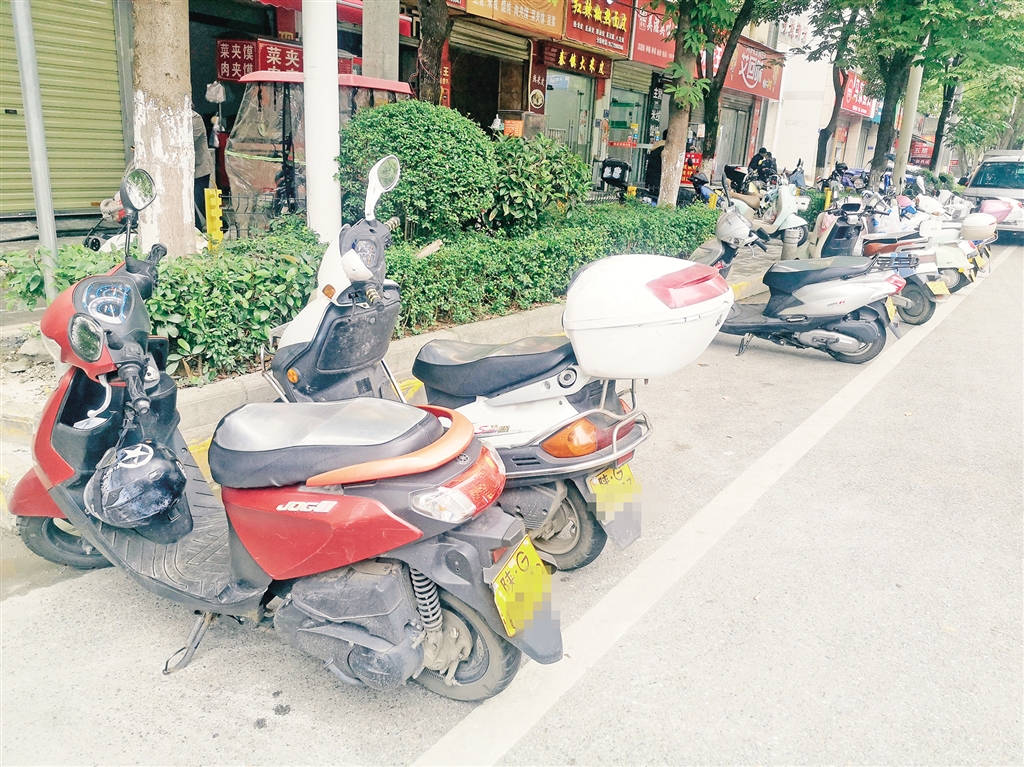 在南環(huán)東路的一個(gè)公交車站臺(tái)旁,幾輛摩托車直接停放在非機(jī)動(dòng)車道上,騎乘人員上下車時(shí)與車流擦肩而過,險(xiǎn)象環(huán)生。附近一名環(huán)衛(wèi)工人告訴記者:“我們清掃起來也很困難,這些車挪不動(dòng)搬不走,車底的垃圾很難清理,有時(shí)候勸兩句,車主還不樂意。”