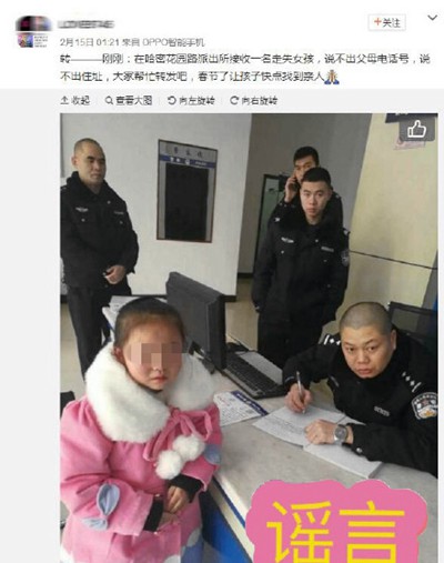 與此類似的謠言還有“在某某路派出所接收一名走失女孩,說不出父母電話號,說不出住址,大家?guī)兔D發(fā)吧,春節(jié)了讓孩子快點找到親人”。經警方核實,該事發(fā)生在四川省自貢市,女孩已于2月13日被其父母接回。該謠言在全國多個省市傳播,各地網警紛紛辟謠,請大家不要繼續(xù)傳播!