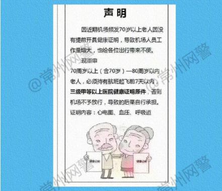 正值春運,朋友圈出現一條“溫馨提示”稱,70周歲以上(含70歲)——80周歲以內老人,必須提供三級甲等以上醫(yī)院健康證明原件,否則機場不予放行。證明內容包括:心電圖、血壓、呼吸道。