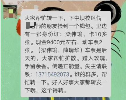 一條“失物招領”的信息在全國多地的微信群和朋友圈中熱傳,該信息稱:“我朋友撿到一個錢包,里邊有一張身份證:梁偉瑜,卡10多張,現金9400元左右,動車票2張(梁偉瑜,薛瑞華)。車票是后天的,大家?guī)兔U散。贈人玫瑰,手留余香。傳遞正能量。失主請聯系:1362098XXXX。誰的群多,幫忙轉一下……”