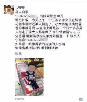 近日,多地網民轉發(fā)圖片稱“今天上午寧繼春的三歲女兒在錦繡花園小區(qū)附近被人拐走了,女兒能說出她爸爸的手機號碼……從監(jiān)控上看,小女孩是被一個四十多歲男人抱走了,現大人都急瘋了,有知情者請告之。萬分感謝……”