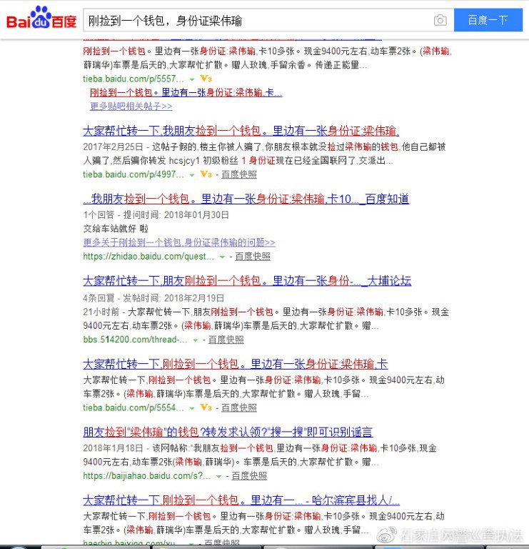 但是,經警方調查,網傳消息中的聯系電話一直無法接通。該手機號碼的歸屬地顯示為廣東深圳,并被多個用戶標記為騷擾電話。通過搜索發(fā)現,這條“失物招領”在網絡上已經流傳很久。除了失主的姓名“梁偉瑜”“薛瑞華”沒變之外,聯系人的電話號碼卻出現過多個版本,類似的“失物招領”虛假信息也有很多。網絡中流傳“徐俊峰”“劉馨心”等多人丟失錢包的網帖,同樣都被證明為謠言。可見,所謂的“失物招領”實際上是一條“陳年老謠”,只要把其中的姓名、聯系方式等信息進行替換,這條謠言便又能改頭換面,重新在網絡中流傳。