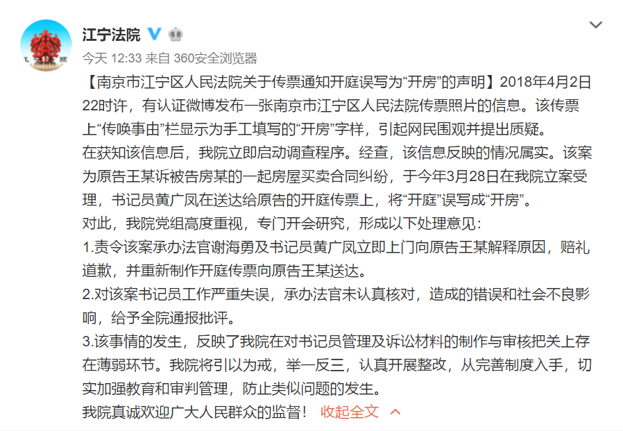 4月3日,南京市江寧區(qū)人民法院官方微博發(fā)表“關(guān)于傳票通知開庭誤寫為‘開房’的聲明”。其中指出,傳票所涉案件為原告王某訴被告房某的一起房屋買賣合同糾紛,于今年3月28日在江寧法院立案受理,書記員黃廣鳳在送達(dá)給原告的開庭傳票上,將“開庭”誤寫成“開房”。