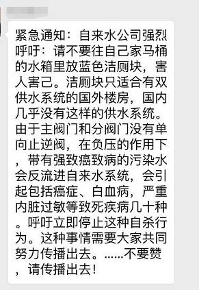 網(wǎng)上熱傳的消息稱,“自來水公司強烈呼吁,請廣大市民不要往自家馬桶的水箱里,放藍色潔廁塊,害人害己,潔廁塊只適合國外有雙供水系統(tǒng)的樓房,國內(nèi)幾乎沒有這樣的供水系統(tǒng),由于主閥門和分閥門,沒有單向止逆閥,在負壓的作用下,帶有強致癌致病的污染水,會反流進自來水系統(tǒng),會引起包括癌癥,白血病,嚴重內(nèi)臟過敏等至死疾病幾十種......”