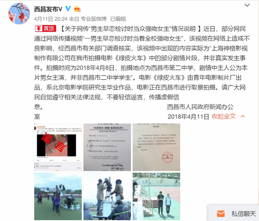 【真相】4月11日,西昌市政府新聞辦官微“西昌發(fā)布”發(fā)表對該視頻的情況說明。經(jīng)查,該視頻中出現(xiàn)的內(nèi)容實際為“上海一影視制作有限公司在西昌市拍攝某電影中的部分劇情片段,并非真實發(fā)生事件。拍攝時間為2018年4月8日,拍攝地點為西昌市第二中學(xué),劇情中主人公為本片男女主演,并非西昌市二中學(xué)學(xué)生”。并附圖“北京市新聞出版廣電局《電影劇本〈梗概〉備案回執(zhí)單》”、“西昌二中關(guān)于網(wǎng)傳‘一早戀男生檢討時強(qiáng)吻女生’視頻的情況說明”及在操場取景拍攝的照片。