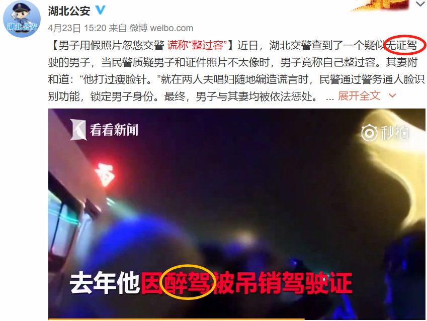 據(jù)“湖北公安”4月23日稱,近日,湖北交警查到了一個疑似無證駕駛的男子,當(dāng)民警質(zhì)疑男子和證件照片不太像時,男子竟稱自己整過容。其妻附和道:“他打過瘦臉針。”就在兩人夫唱婦隨地編造謊言時,民警通過警務(wù)通人臉識別功能,鎖定男子身份。該男子去年因醉駕被吊銷駕駛證,最終,男子與其妻均被依法懲處。