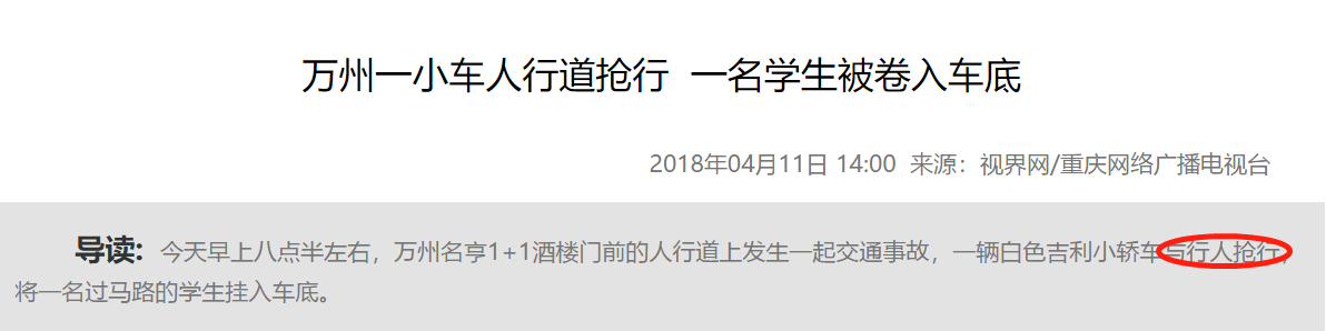 4月11日,重慶市萬州區(qū)某酒樓門前的人行道上發(fā)生一起交通事故,一輛白色吉利小轎車與行人搶行,將一名過馬路的學(xué)生掛入車底。眾人將汽車抬起后,受傷兒童被救出并送往三峽中心醫(yī)院搶救。