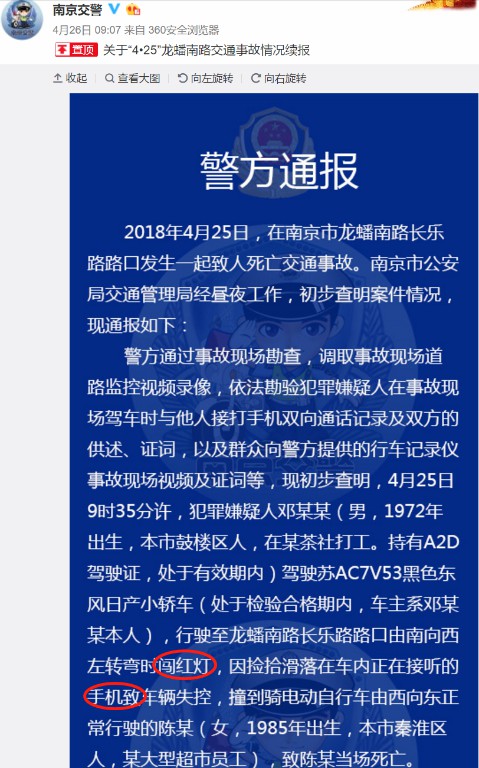 2018年4月25日,在江蘇省南京市發(fā)生一起致人死亡交通事故。經(jīng)警方調(diào)查,犯罪嫌疑人鄧某某駕駛某小轎車行駛至龍蟠南路長樂路路口由南向西左轉(zhuǎn)彎時闖紅燈,因撿拾滑落在車內(nèi)正在接聽的手機(jī)致車輛失控,撞到騎電動自行車由西向東正常行駛的陳某,致陳某當(dāng)場死亡。