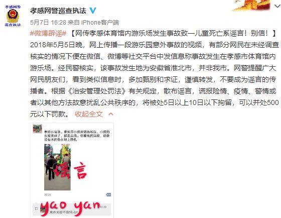 網(wǎng)傳的10秒長的小視頻顯示,在一個游樂場中,一名年輕女子坐在地上不斷哭喊,在其旁邊的游樂設(shè)施上,一名男子抱著一個孩子,地上滿是鮮血。視頻所配文字稱:“這是某地今天發(fā)生的,以后不要帶孩子坐這個玩具了!”其中,“某地”被傳為河北石家莊、云南大理、陜西漢中、湖北孝感等多地的游樂場,引發(fā)網(wǎng)民關(guān)注熱議。