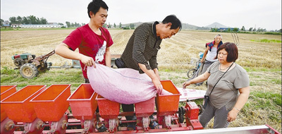 5月29日,在河南省南陽市唐河縣黑龍鎮(zhèn)大朱莊村,農(nóng)民在給播種機添加種子。目前,唐河縣農(nóng)民利用有利的天氣條件,搶抓農(nóng)時,播種花生、玉米等農(nóng)作物。(記者 馮大鵬 攝) Fd8安康新聞網(wǎng)