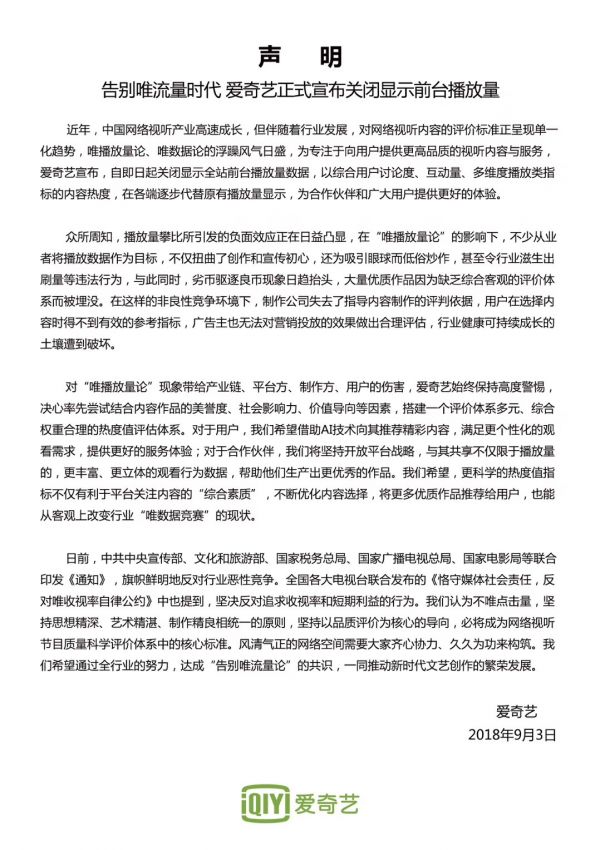 對此,愛奇藝回復稱,“我們也將持續(xù)觀察市場最新狀態(tài),如果市場前臺流量數據能夠凈化到基本真實、公平反映內容價值的程度,不排除恢復前臺流量顯示!