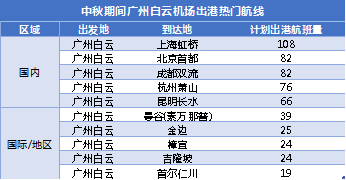 中秋期間廣州白云機(jī)場出港熱門航線。