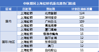 中秋期間上海虹橋、浦東機(jī)場出港熱門航線。