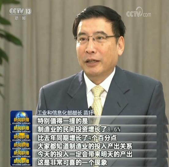 日前,工業(yè)和信息化部部長(zhǎng)苗圩接受本臺(tái)記者專訪表示,今年前八個(gè)月工業(yè)經(jīng)濟(jì)運(yùn)行穩(wěn)定,制造業(yè)亮點(diǎn)頗多,下一步將切實(shí)降低中小企業(yè)負(fù)擔(dān),促進(jìn)金融支持實(shí)體經(jīng)濟(jì)的發(fā)展。
