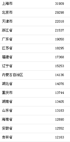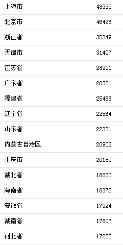 國(guó)家統(tǒng)計(jì)局公布的31省份居民人均可支配收入顯示,上海、北京、浙江前三季度居民人均可支配收入排名前三。