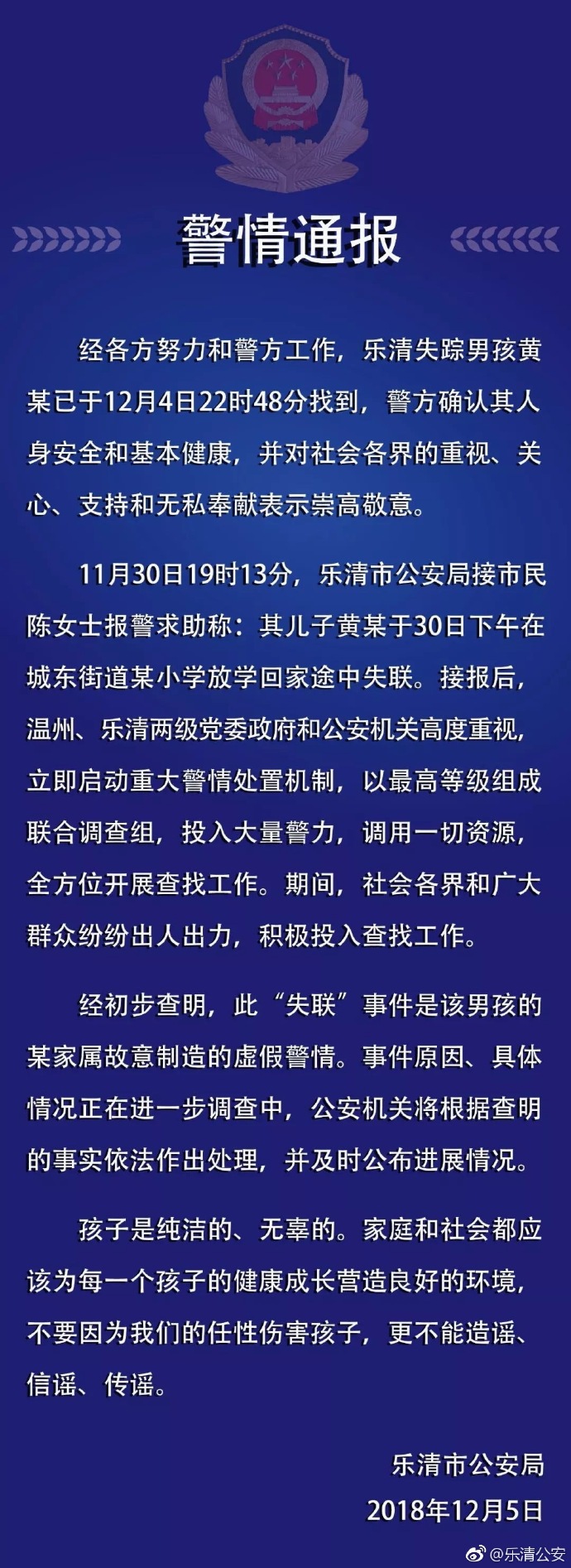 浙江省樂清市公安局官方微博5日凌晨發(fā)布警情通報稱,經各方努力和警方工作,樂清失蹤男孩黃某已于12月4日22時48分找到,警方確認其人身安全和基本健康,并對社會各界的重視、關心、支持和無私奉獻表示崇高敬意。