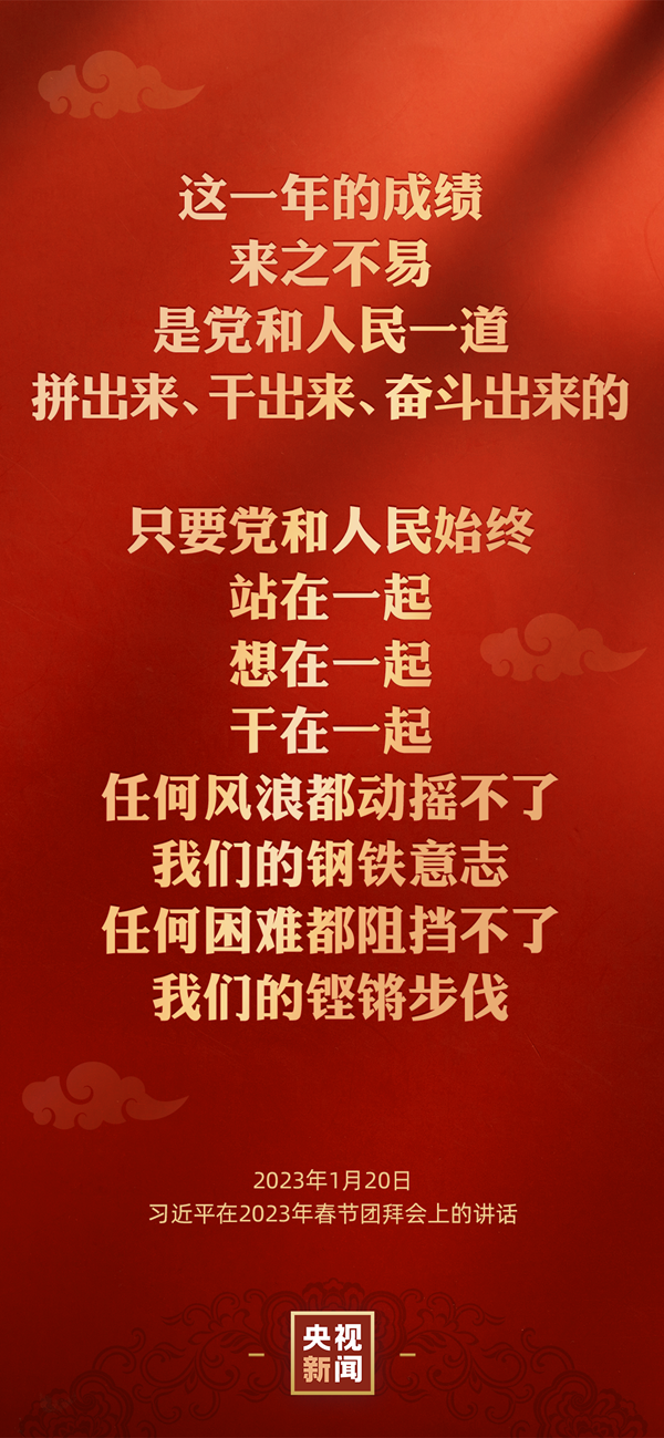 中共中央、國(guó)務(wù)院20日上午在人民大會(huì)堂舉行2023年春節(jié)團(tuán)拜會(huì)。中共中央總書記、國(guó)家主席、中央軍委主席習(xí)近平發(fā)表講話,代表黨中央和國(guó)務(wù)院,向全國(guó)各族人民,向香港特別行政區(qū)同胞、澳門特別行政區(qū)同胞、臺(tái)灣同胞和海外僑胞拜年。VTx安康新聞網(wǎng)