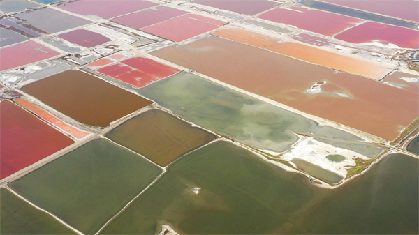 △運(yùn)城鹽湖。夏季是鹽湖里微生物繁衍的旺盛期,不同的微生物使得鹽湖的不同池水呈現(xiàn)出不同的色彩,造就了七彩鹽湖的奇觀。(總臺記者裴大偉拍攝)