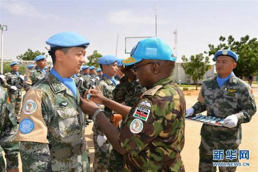 7月15日,在蘇丹達(dá)爾富爾法希爾,聯(lián)合國(guó)和非洲聯(lián)盟駐達(dá)爾富爾聯(lián)合特派團(tuán)(聯(lián)非達(dá)團(tuán))部隊(duì)司令恩貢迪中將(右二)把勛章佩戴在中國(guó)維和官兵胸前。中國(guó)首支維和直……
