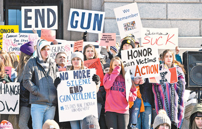 | 2月21日,在美國(guó)科羅拉多州丹佛市,眾多師生和民眾聚集在州議會(huì)大樓外示威,紀(jì)念佛羅里達(dá)州校園槍擊案遇難者,呼吁控槍。人民視覺(jué) |