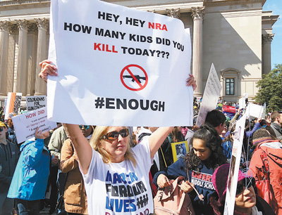 3月24日,來自全美各地的近50萬人涌入美國首都華盛頓,參加以“為了我們的生命”為主題的反對槍支暴力大游行。游行者呼吁美國政府采取更加嚴格的控槍措施,保護校園安全,同時要求政客們不再接受美國全國步槍協(xié)會等團體的政治獻金。這一天,從紐約、波士頓、洛杉磯,再到上月發(fā)生校園槍擊案的佛羅里達州帕克蘭,同一主題的大游行在全美390多個城市同步舉行。美國民眾尤其是青少年學生紛紛走上街頭,響亮地發(fā)出他們的聲音:“面對槍支暴力,我們不再沉默,政客們必須在控槍問題上有所作為。”