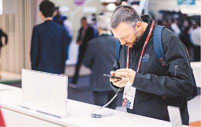 | 2月26日,2018年世界移動(dòng)通信大會(huì)在西班牙巴塞羅那會(huì)展中心開幕。圖為國(guó)外參會(huì)者在中國(guó)手機(jī)品牌小米的展臺(tái)前參觀體驗(yàn)。智 淵攝 |