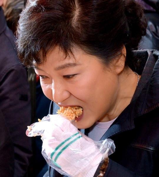 2012年11月,總統(tǒng)候選人樸槿惠現(xiàn)身傳統(tǒng)市場(chǎng),購買糕點(diǎn)并品嘗。