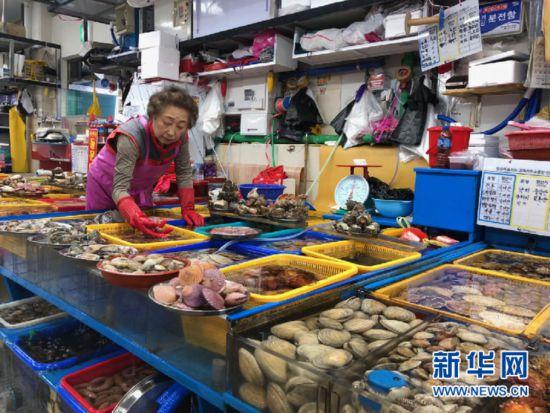 圖為韓國釜山札嘎其水產(chǎn)市場內(nèi)一家貝類水產(chǎn)攤位。新華社記者 耿學(xué)鵬 攝