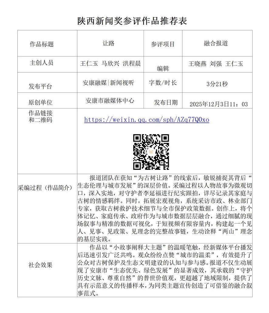 根據(jù)《陜西新聞獎(jiǎng)、陜西省優(yōu)秀新聞工作者評(píng)選辦法》和《關(guān)于開展2025年度陜西新聞獎(jiǎng)融合報(bào)道、應(yīng)用創(chuàng)新和新媒體新聞專欄作品推優(yōu)工作的通知》要求,經(jīng)個(gè)人申報(bào)、部門推薦和中心編委會(huì)嚴(yán)格篩選,對(duì)以下3件2025年度陜西新聞獎(jiǎng)融合報(bào)道、應(yīng)用創(chuàng)新、新媒體新聞專欄參評(píng)作品進(jìn)行公示。(作品推薦表附后)